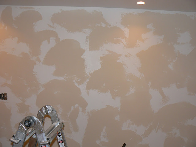 Here’s what we did. First, we randomly scrapped joint compound on the walls.