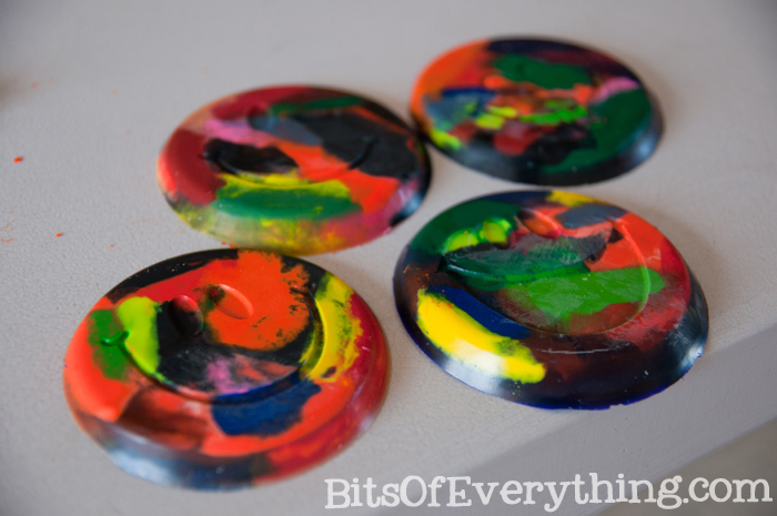 Next, we cleaned out all of the broken crayons to make new ones. Using tips from Better in Bulk we made cute smiley face crayons. My kids enjoyed watching them melt! Be sure to fill up your shape you are melting into. Our first ones were really thin. Also, be careful taking them out of the oven. I was a little shaky and the colors mixed together a little bit making them not as cute.