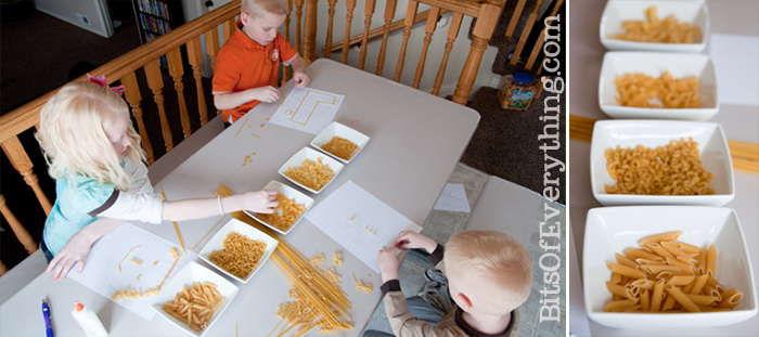 For our day off of school on Monday, I thought I would entertain my kids with some crafts. Luckily, I had some ideas up my sleeve. I saw this first one posted a while ago on Infarrantly Creative. Such a fun and easy craft to pull off. All the materials needed were right in the pantry – well except the glue. 🙂 We loved doing noodle art and we will probably be doing it again. Next time I might even attempt to color my noodles like THIS.