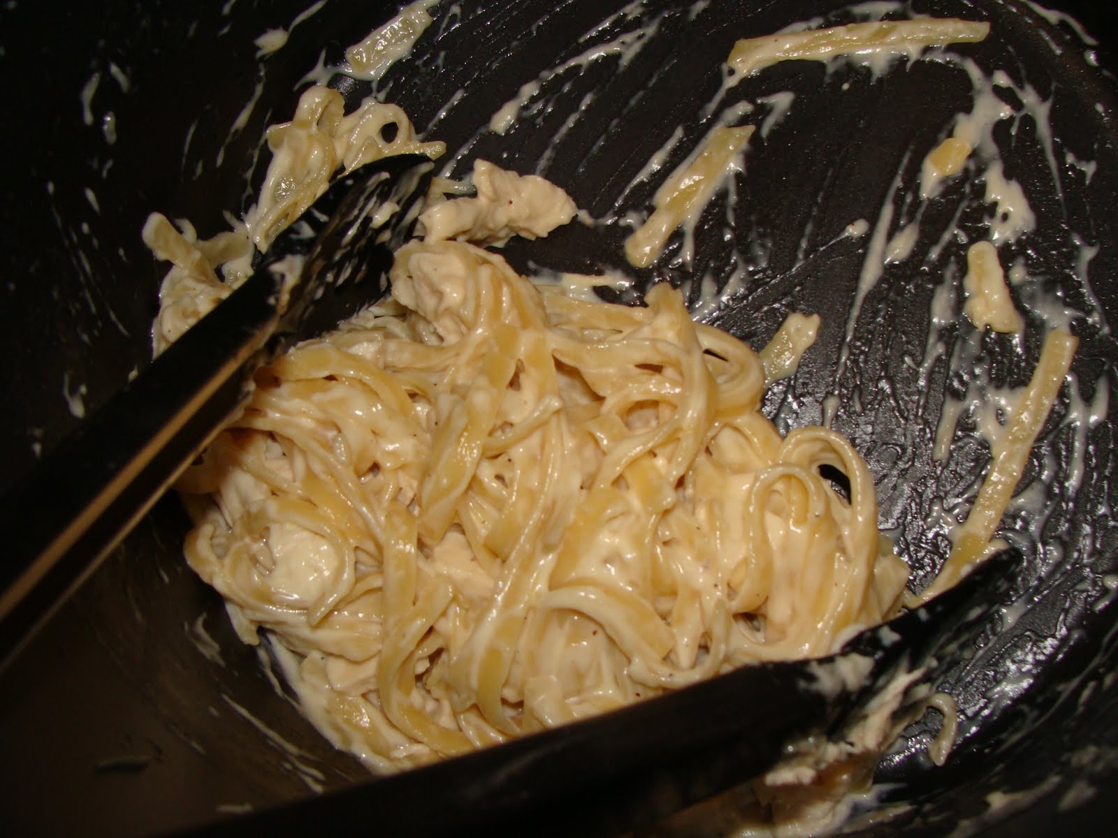 We cooked a couple chicken breasts and cubed them up to toss into the hot Fettuccine.