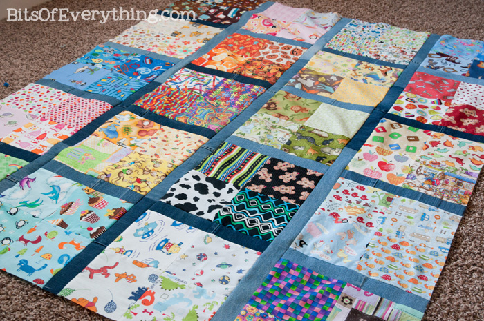 Quilting is fun, but quilting with friends is even more fun! I have done several quilts with friends. They are usually scappy quilts, so that your fabrics don’t have to match. My latest quilt that I have made with friends is and I-spy quilt. I saw an invitation (a while ago) on A Girl and a Glue Gun to make an I-spy quilt. Luckily, I responded quickly to participate. We all cut blocks (10 blocks of 10 different fabrics) and sent them to Kimbo. She swapped the blocks around and sent us all 100 different blocks back. I’ve been working hard to get my quilt top all pieced together. What do you think? My kids are so excited for this to be our new picnic blanket. (I will still add a denim border before I quilt and bind it.)