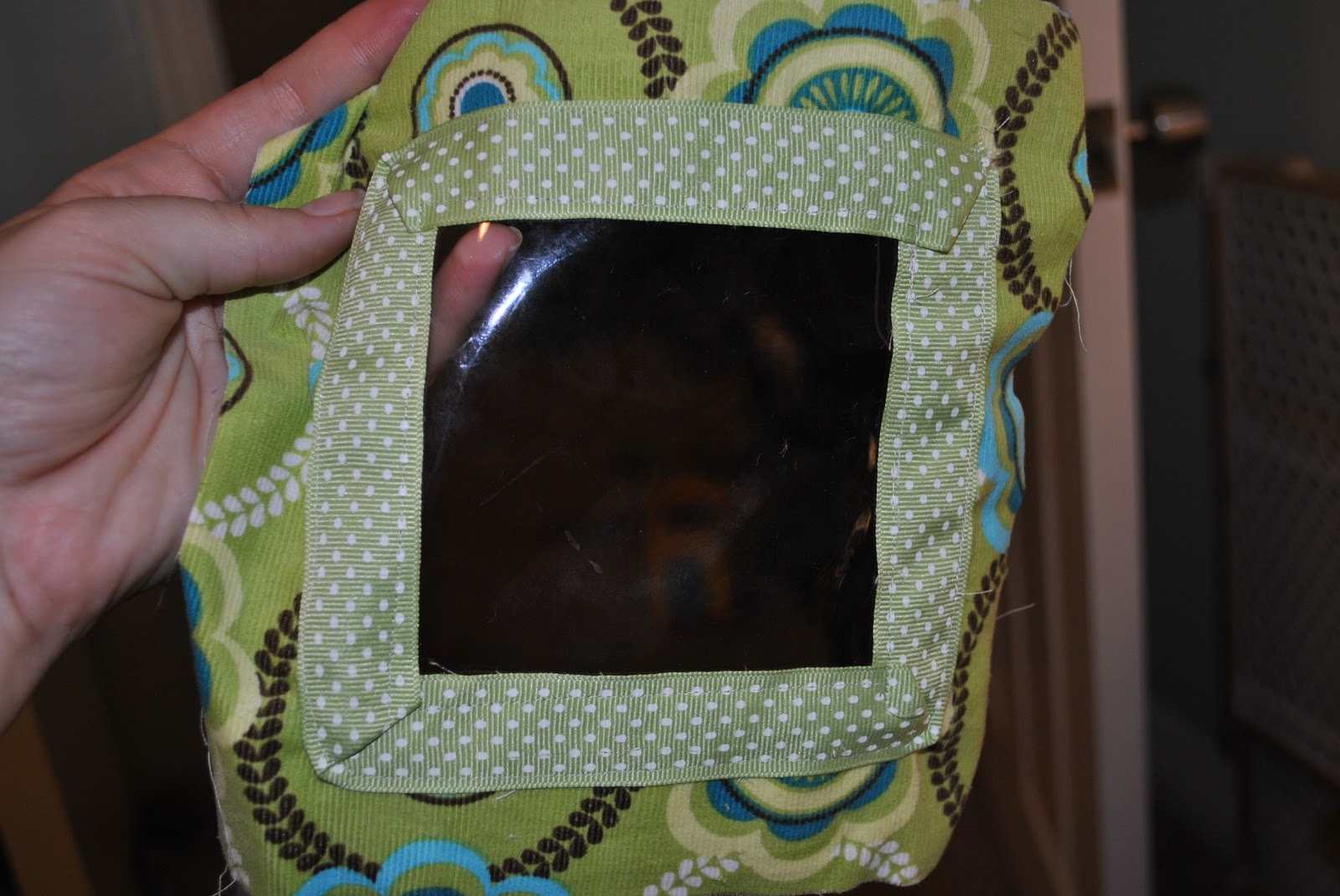 Now, cut out a square out of your heavy plastic and sew it on. Make it 5×5, (your square should be about 4×4)