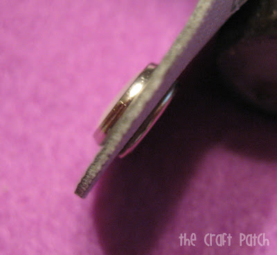 Now do the other side of the bracelet. Place the outie part of the snap on the right side of the fabric and center it. Push the prongs through like before. There’s no picture of the inside of this one, but you’ll put a little ring over the prongs and hammer until it’s flat. Then you are DONE!