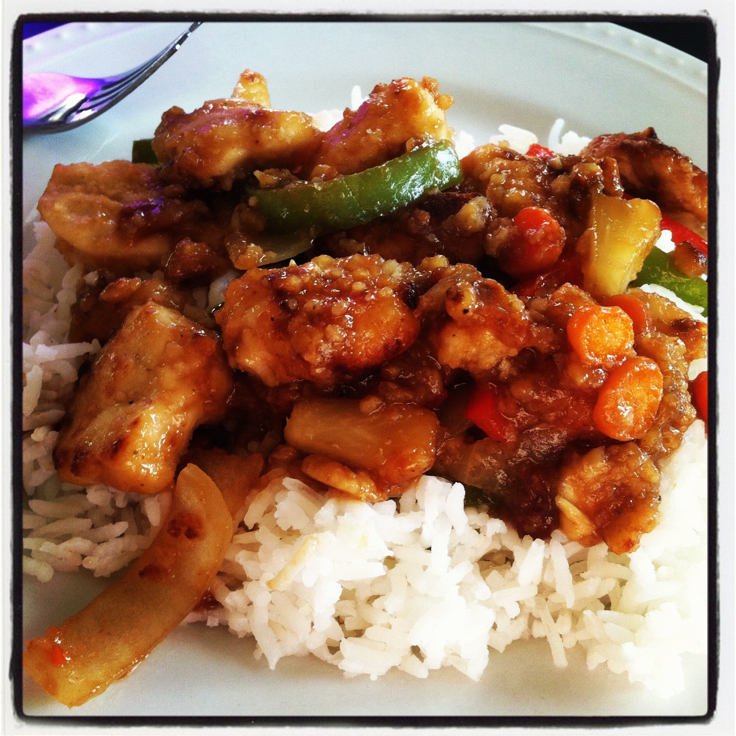 My family is a lot smaller than the family this recipe was made for, so I used 3 chicken breasts cut up, half of a green pepper, half of a red pepper, and a small amount of onions. I used one cup of bisquick, half the pepper, and only 2 eggs. I also only used one can of pineapple.  I did use the exact same measurements for the sauce though, because I never feel like there’s enough sauce.. and it was the perfect amount.  I cooked 2 cups of rice.  It was fantastic! Give it a try!