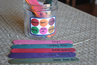 For one of the classes we made a chore jar. The Popsicle sticks are color coded with the spots on the back of the jar. You can of course adapt these jobs to the age of your kids. It has been a great thing for my little 5 year old. We are always looking for new ways to motivate him and get him excited about helping out a little.