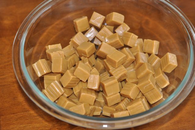 We doubled the caramel recipe because we were doing ten apples. This is two 14 oz. packages of caramel candies that we unwrapped.