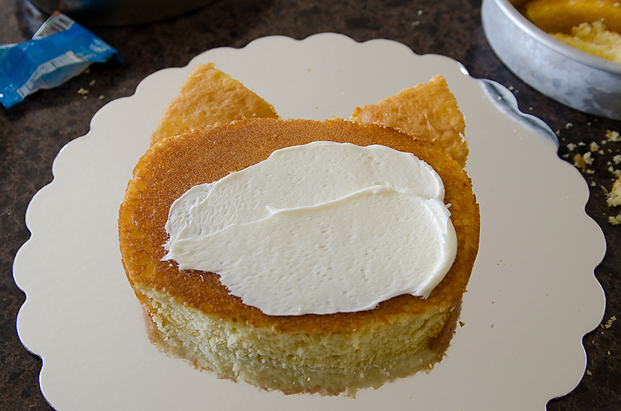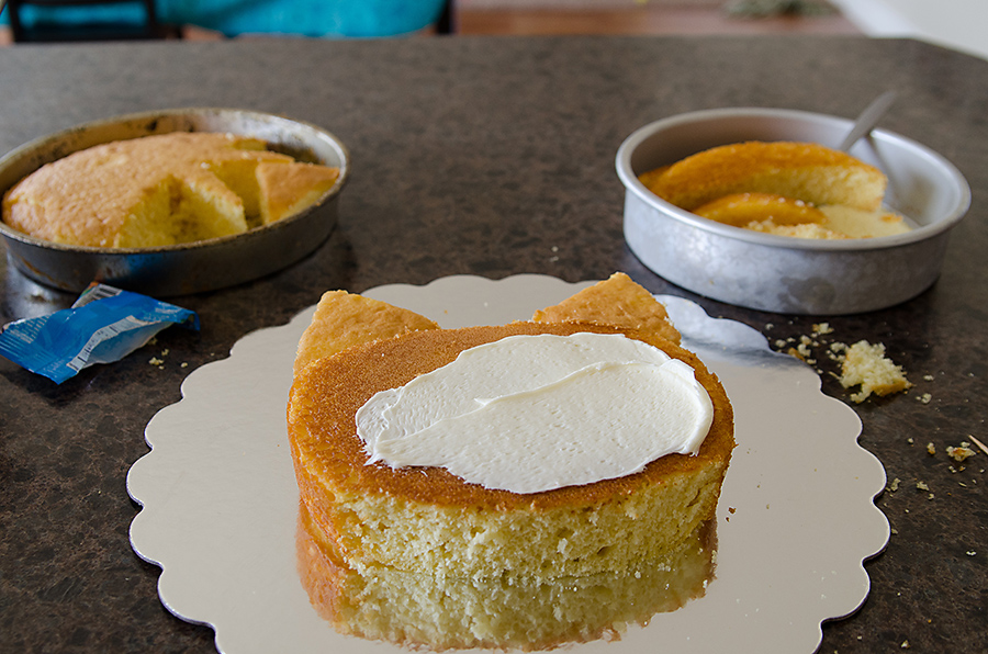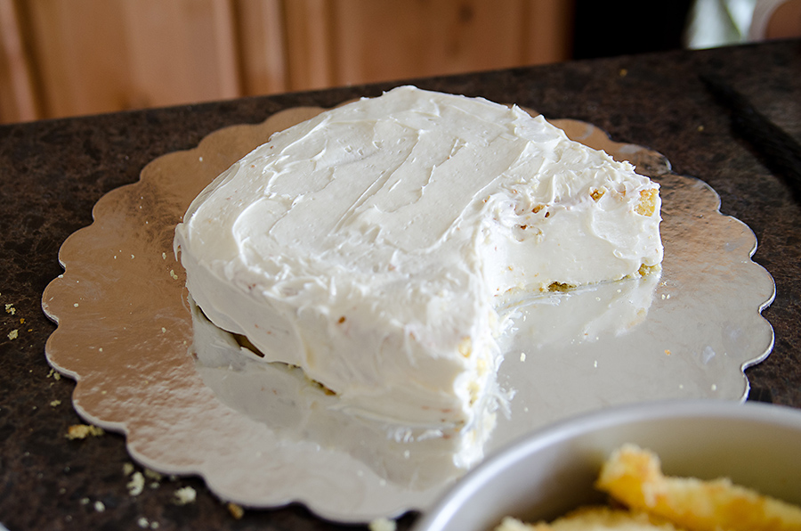 Then I covered the whole thing with white frosting to keep the crumbs under control… this was probably the hardest part with the super moist cake.