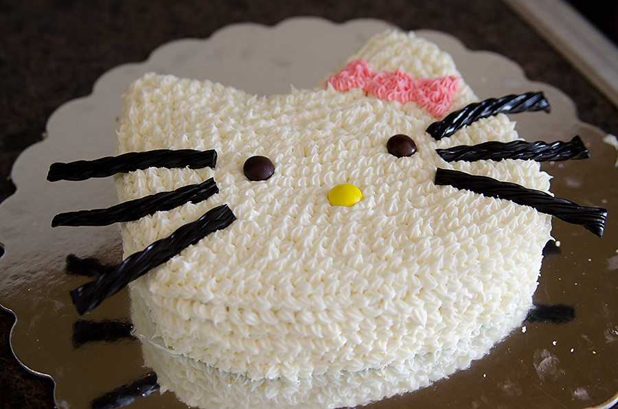 Then I used a decorating tip and did little stars (is that what you call them?) over the whole cake. Again- it’s not perfect. I made a little pink frosting and made a little bow… and then we added black licorice for the whiskers, and peanut butter m&ms for the eyes and nose. (I was supposed to use jelly beans for that part… but I had the m&ms on hand.)