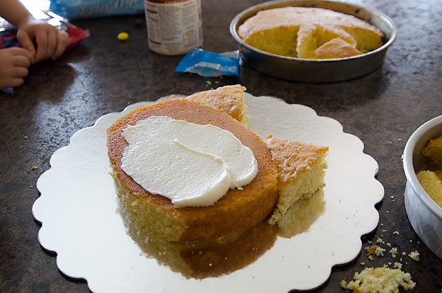 Then I covered the whole thing with white frosting to keep the crumbs under control… this was probably the hardest part with the super moist cake.