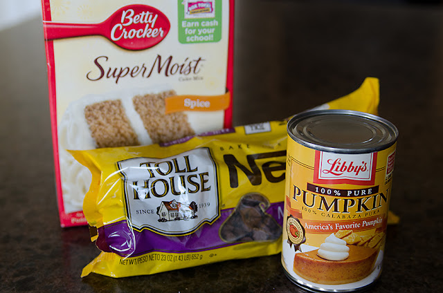 Mix the pumpkin and the cake mix together, and then add the chocolate chips.