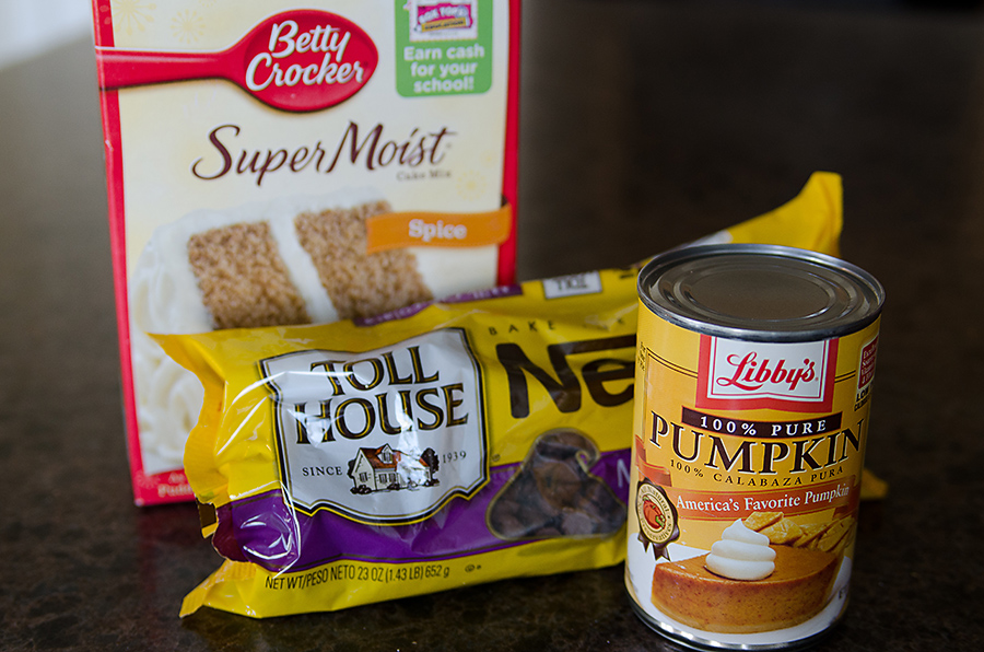 Mix the pumpkin and the cake mix together, and then add the chocolate chips.