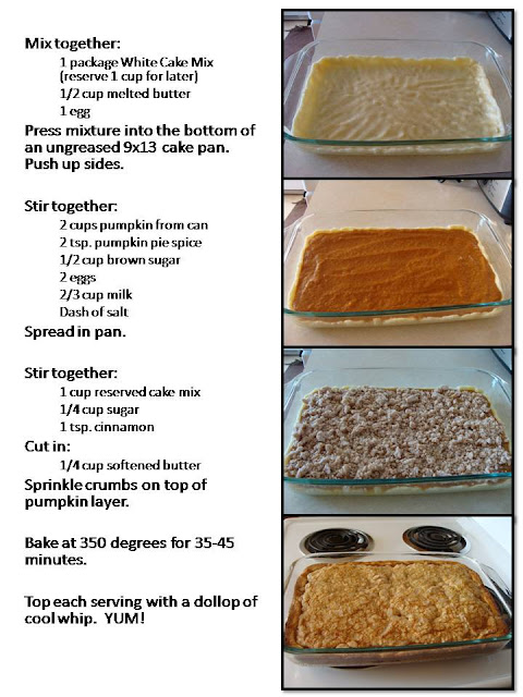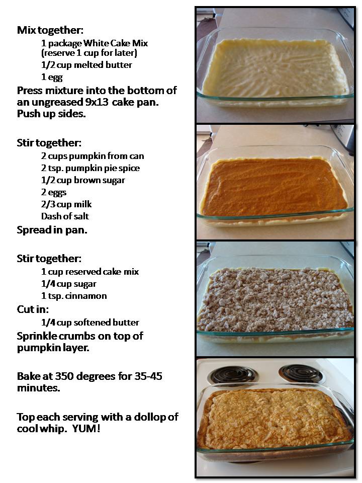 Pumpkin Pie Squares This is the dessert that I took to our last family get together. This a great time of year to enjoy them! Pumpkin Pie Squares By HollyOctober 29, 2012Ashlee, Recipes1 Comment on Pumpkin Pie Squares