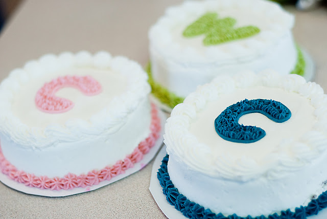 Ashlee ordered white 5 inch cakes from Macey’s bakery, and then she used a cookie cutter to outline the letter she wanted, and put the letter of their name on top in the color that matched their onsie.